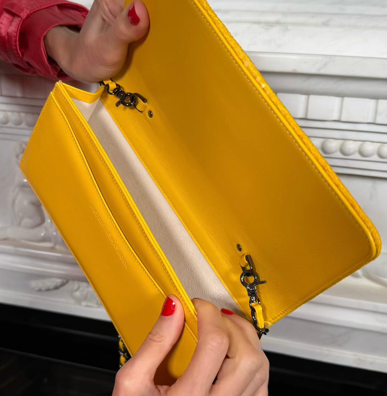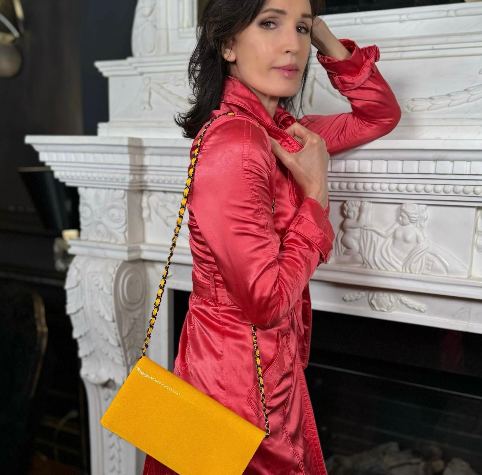 - Bag Dimensions and materials: sustainably sourced stingray, genuine yellow leather