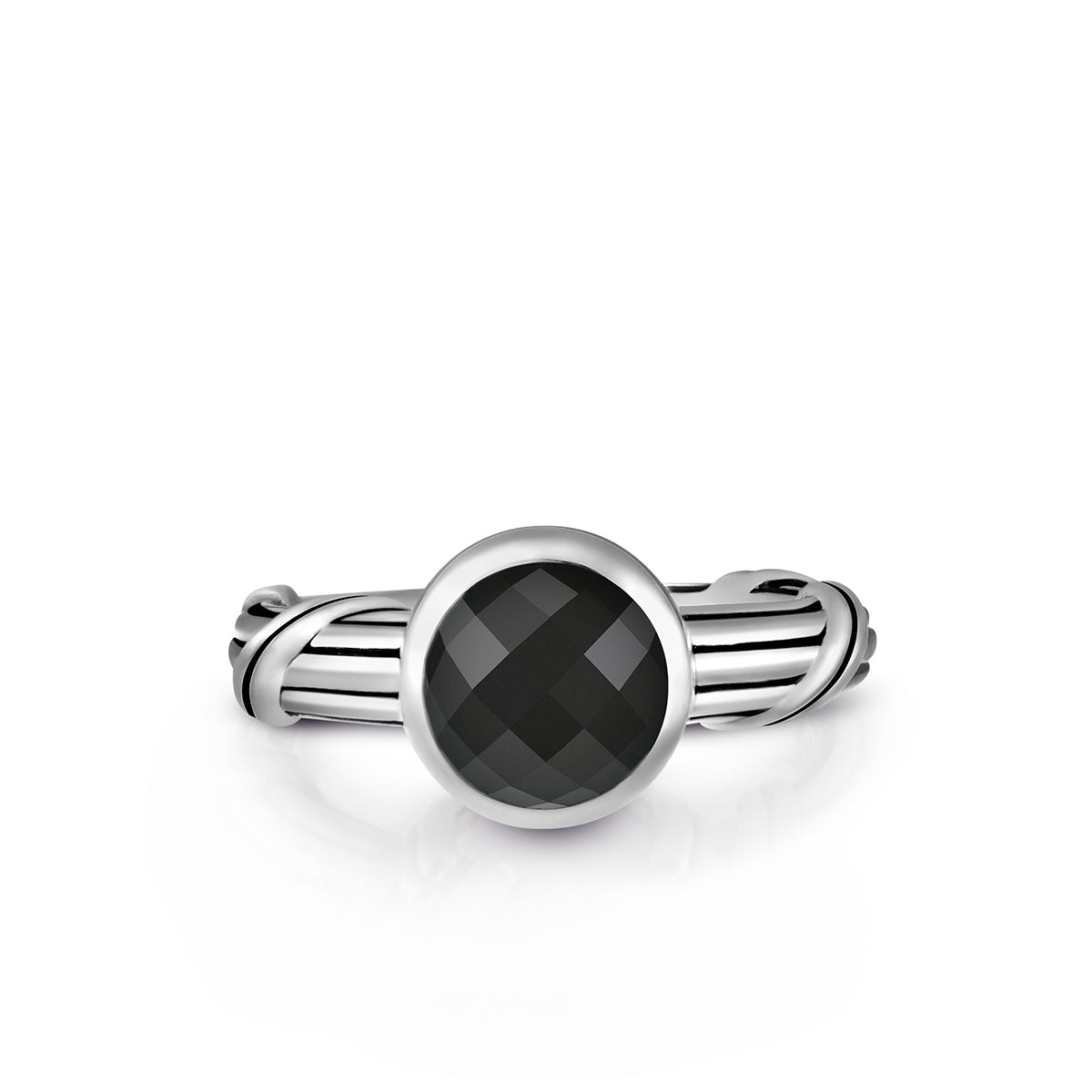 Peter Thomas Roth's iconic Ribbon & Reed motif sets the stage for Fantasies, a radiant collection of statement-making gemstone solitaire rings, ready to capture eyes and win hearts. Each ring showcases a jewel of the utmost quality, brilliantly faceted and cradled in sterling silver. Cast and finished by hand, this exquisite round bezel-set gemstone ring reveals a black onyx.