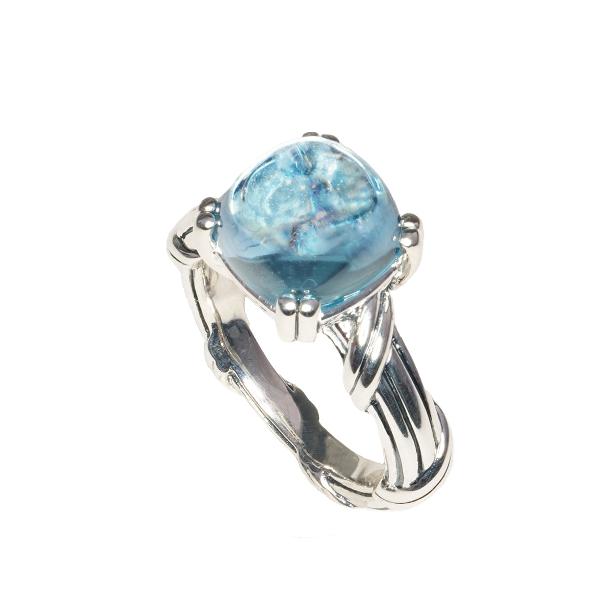 Dreams come true with artfully crafted, luminous gemstone designs in Peter Thomas Roth’s Ribbon & Reed Fantasies Collection. Discover a lustrous palette of gems specially cut to reveal one of a kind radiance in rich hues of blue, rose, yellow, and more. Shine brilliantly with these modern creations in sterling silver or 18K gold. Cast and finished by hand, this exquisite sterling silver cocktail ring reveals a cushion-cut cabochon blue topaz.