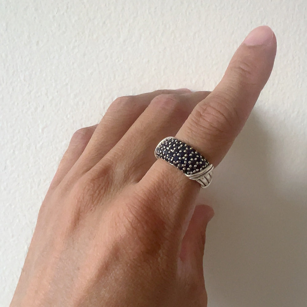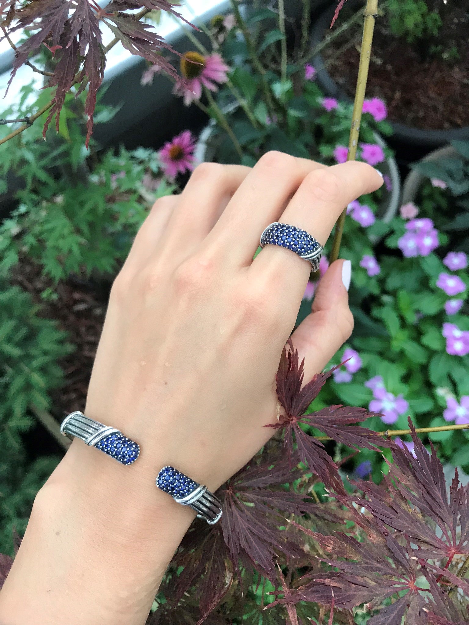 Inspired by an iconic motif, interpreted for today, Ribbon and Reed Signature Classic epitomizes modern elegance. Cast and finished by hand, this precious gemstone sterling silver pave band ring reveals beautiful blue sapphires. Wonderful for stacking or perfect as a promise ring.