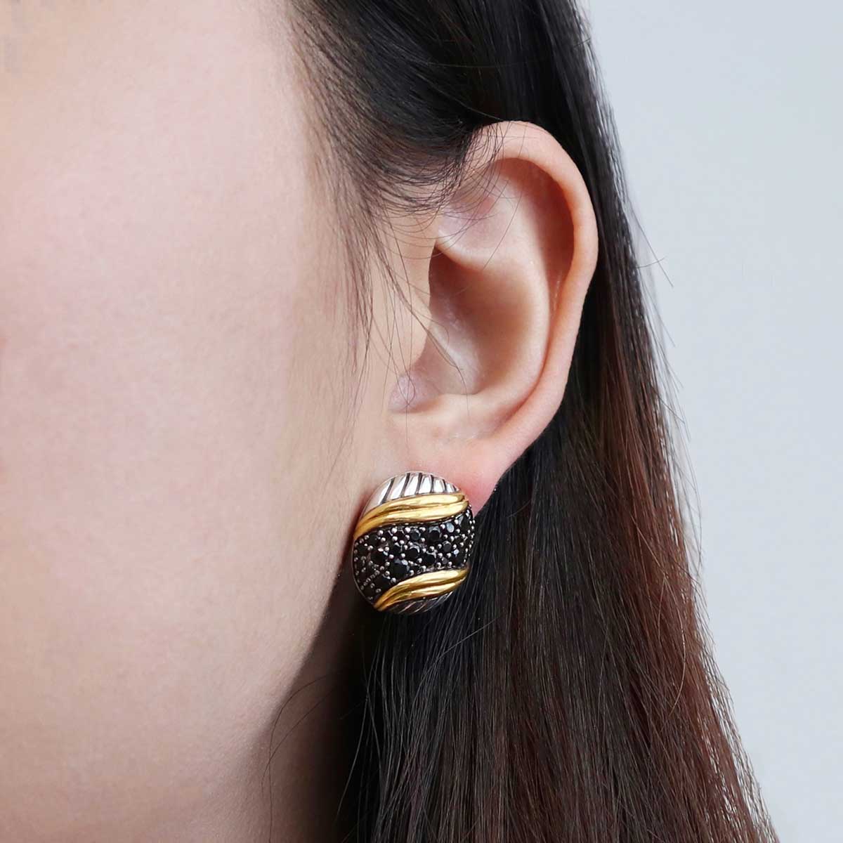 Soho Currents Button Earrings in two tone sterling silver with black spinel
