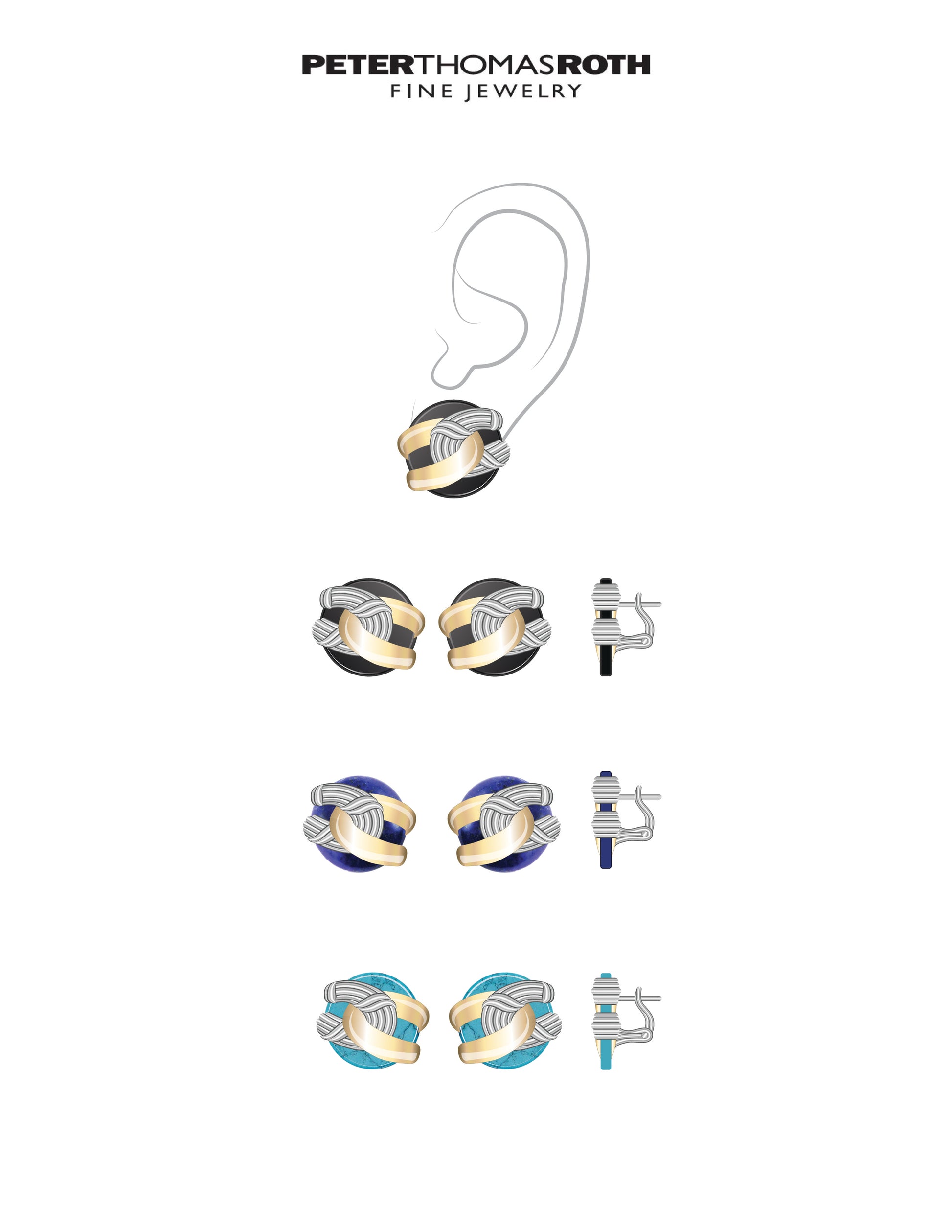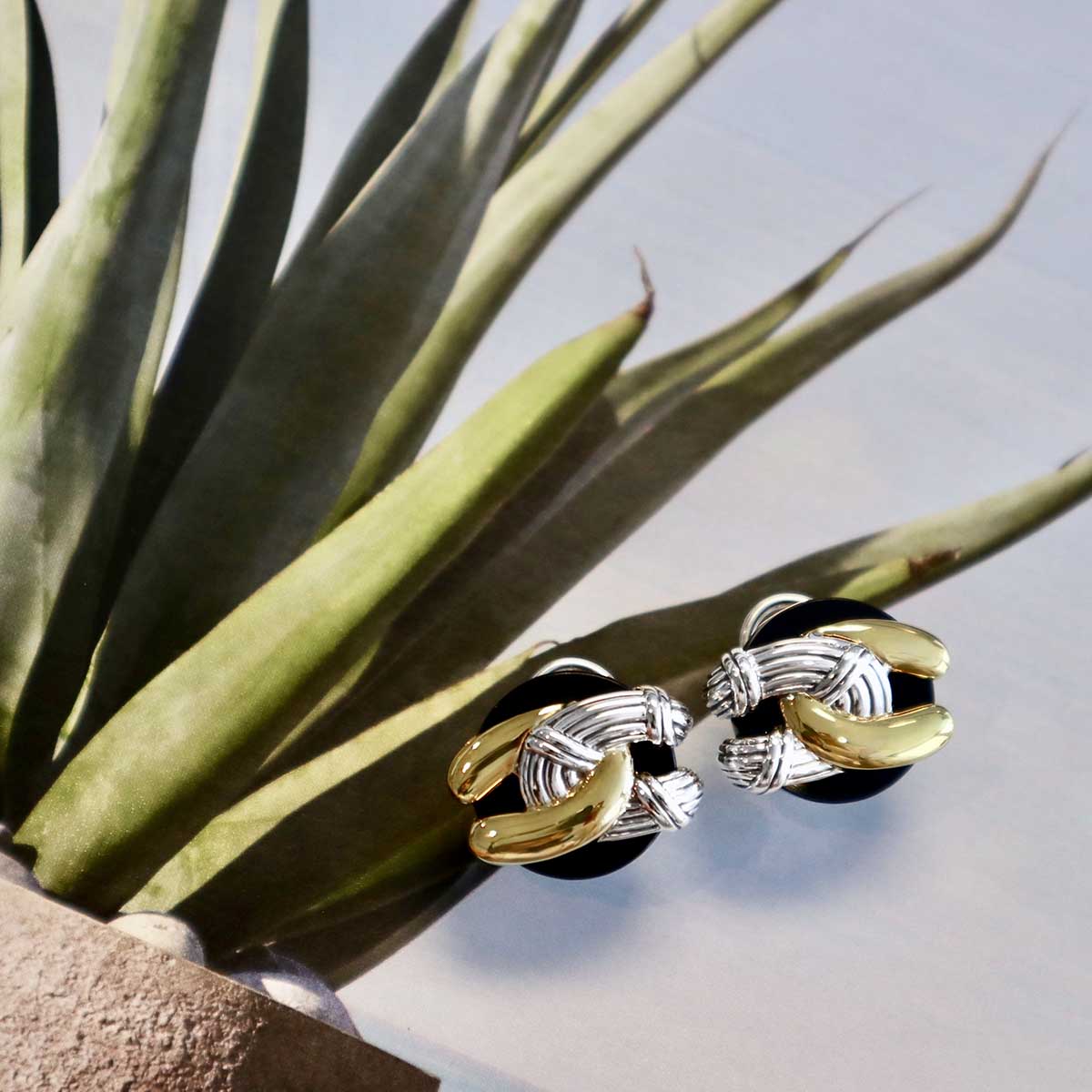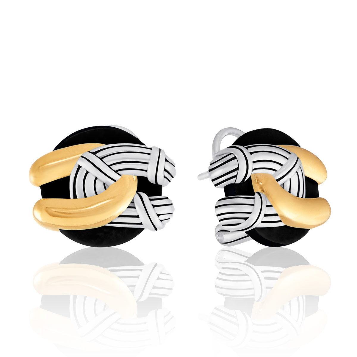 Southampton Disc Knot Earrings in two tone sterling silver with black onyx