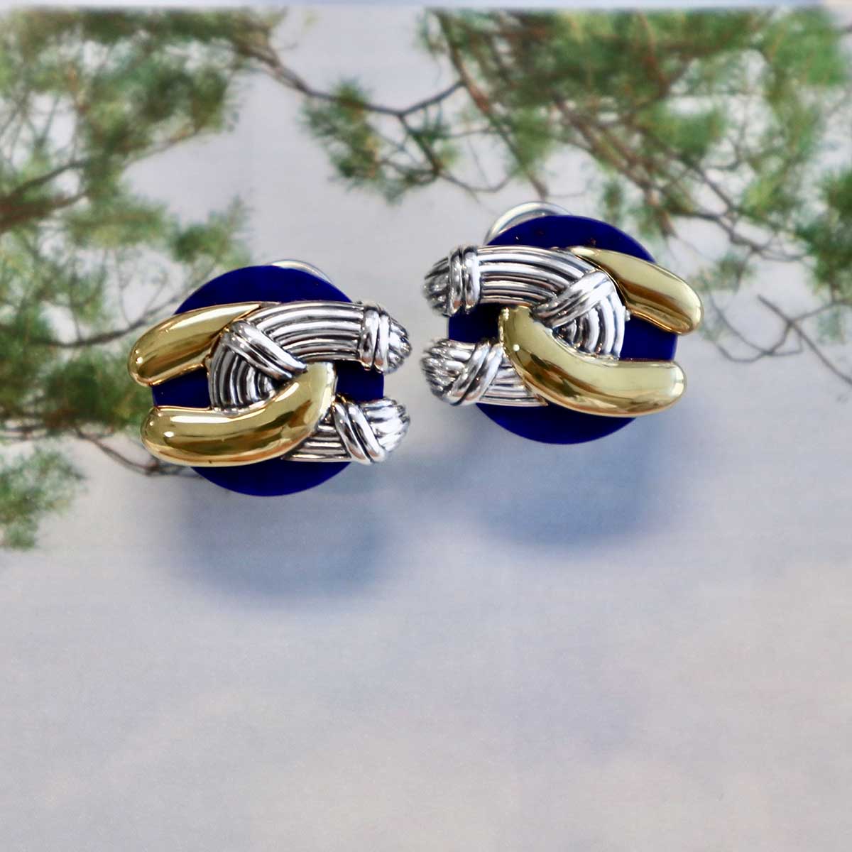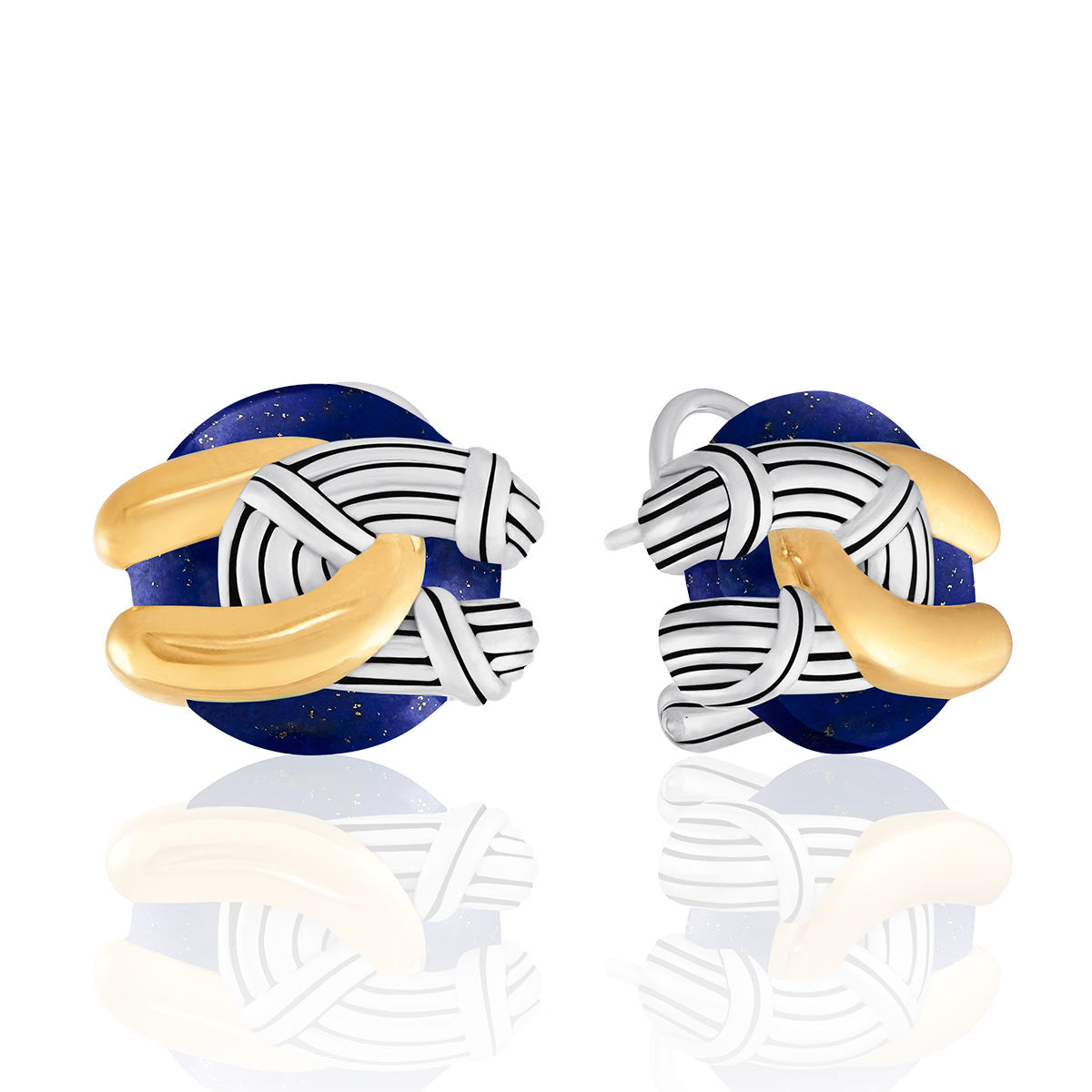 Southampton Disc Knot Earrings in two tone sterling silver with lapis