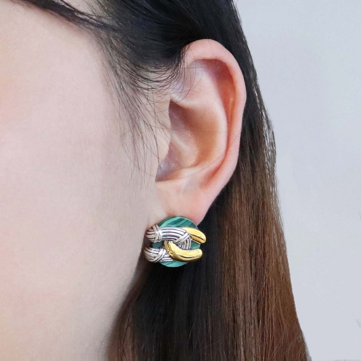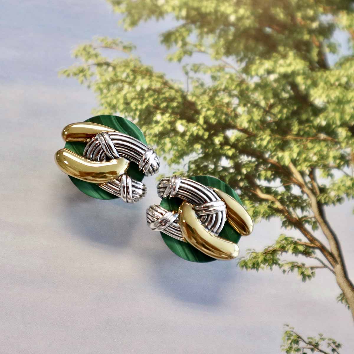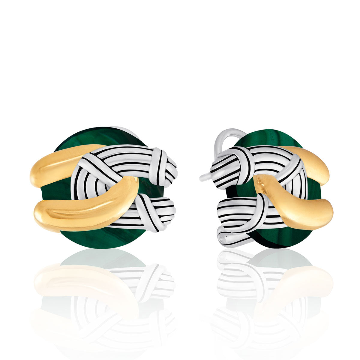 Southampton Disc Knot Earrings in two tone sterling silver with malachite